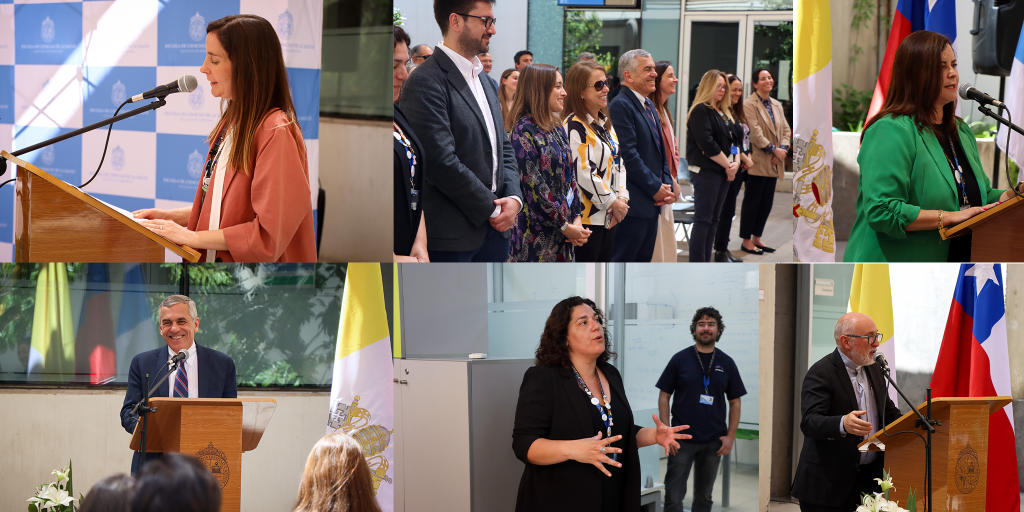 Reunidos en el zócalo del edificio de la Escuela, autoridades de la Facultad de Medicina UC, como el decano, Dr. Felipe Heusser; la vicedecana, Dra. Marcela Cisternas; la directora de la Escuela de Ciencias de la Salud, Javiera Fuentes; académicos, funcionarios y estudiantes presenciaron la ceremonia oficial de apertura de los nuevos espacios del edificio.