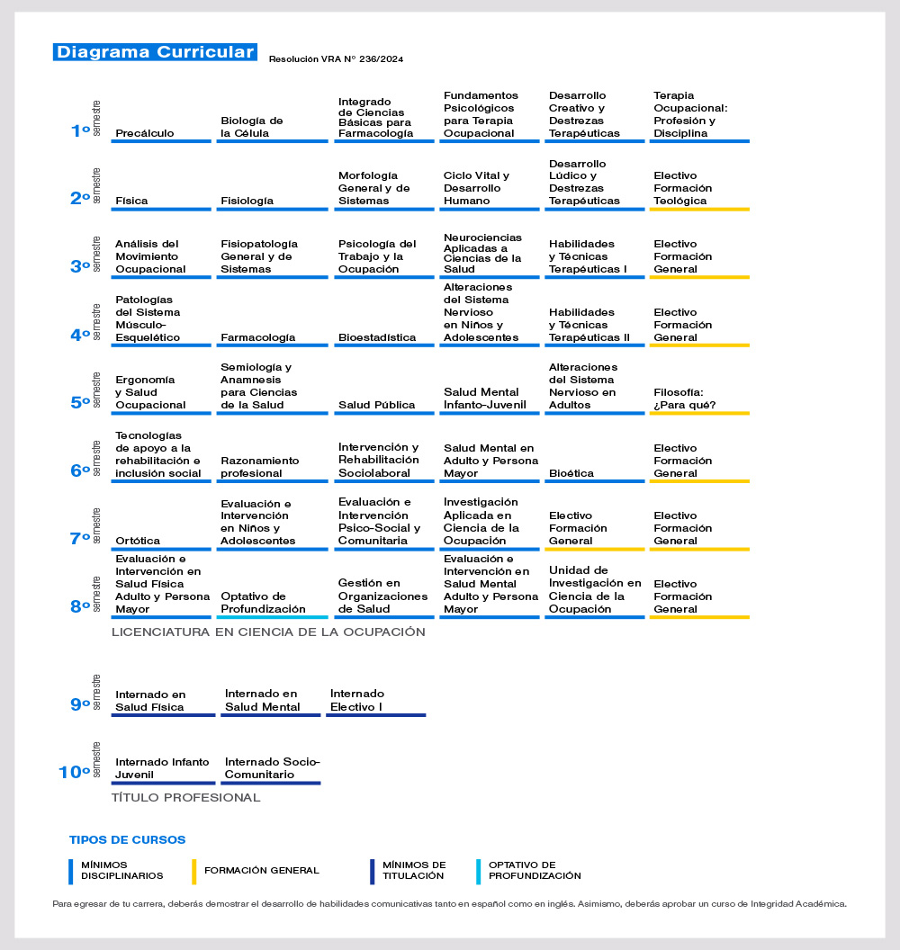 Curso de carácter teórico práctico, que contribuye a formar las bases de la profesión, necesarias para valorar el aporte de la disciplina. En este curso se abordan los principales conceptos de la Ciencia de la Ocupación, integrando la Práctica Basada en la Evidencia como modelo para desarrollar habilidades de razonamiento clínico como fundamento de la intervención y destrezas básicas de la Terapia Ocupacional. Se realizará análisis ocupacional, considerando los componentes y el contexto de ejecución, a través de metodologías de aprendizaje activas y evaluaciones teórico prácticas.